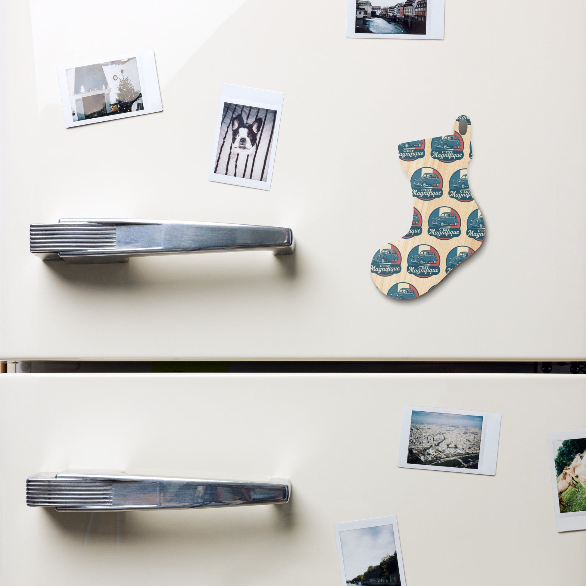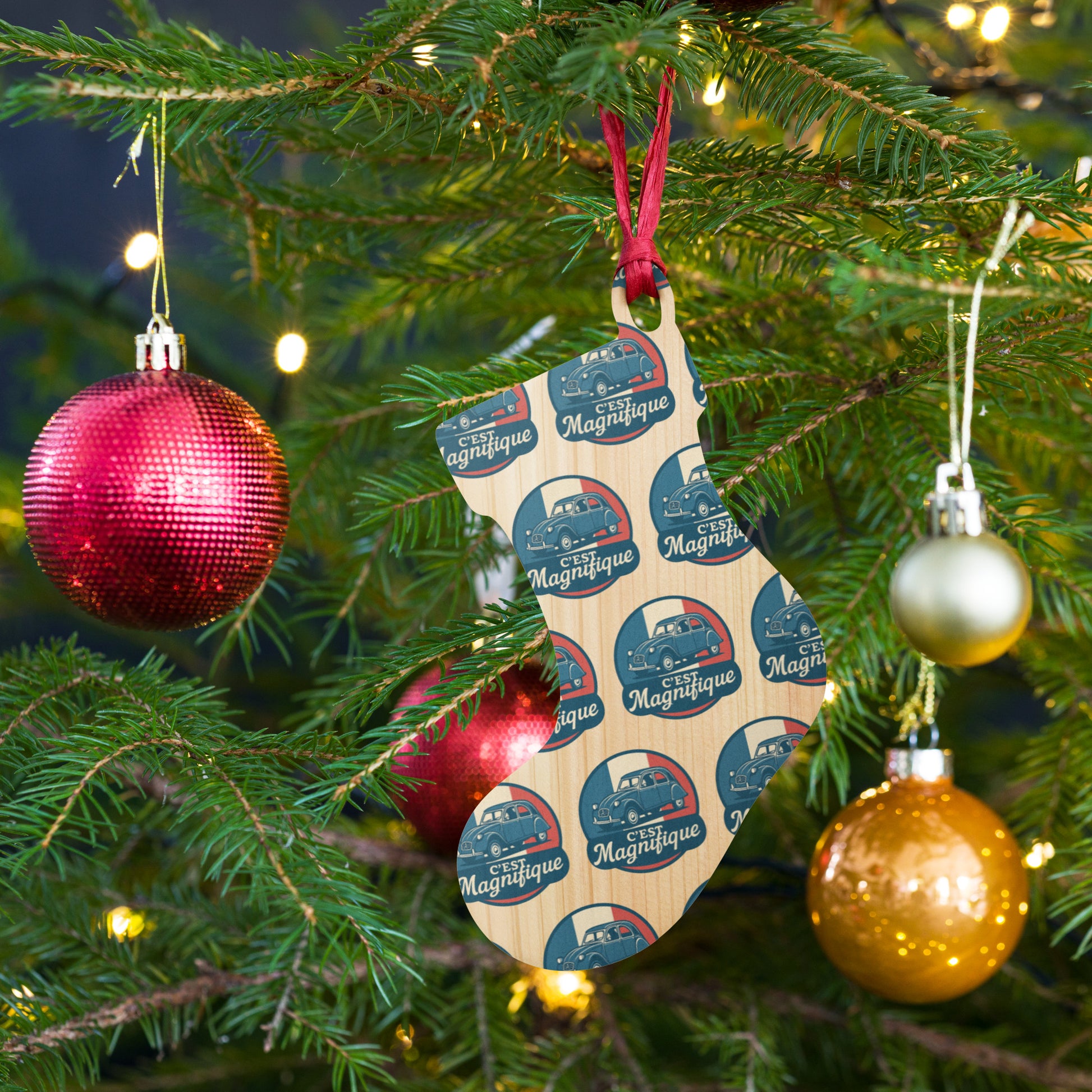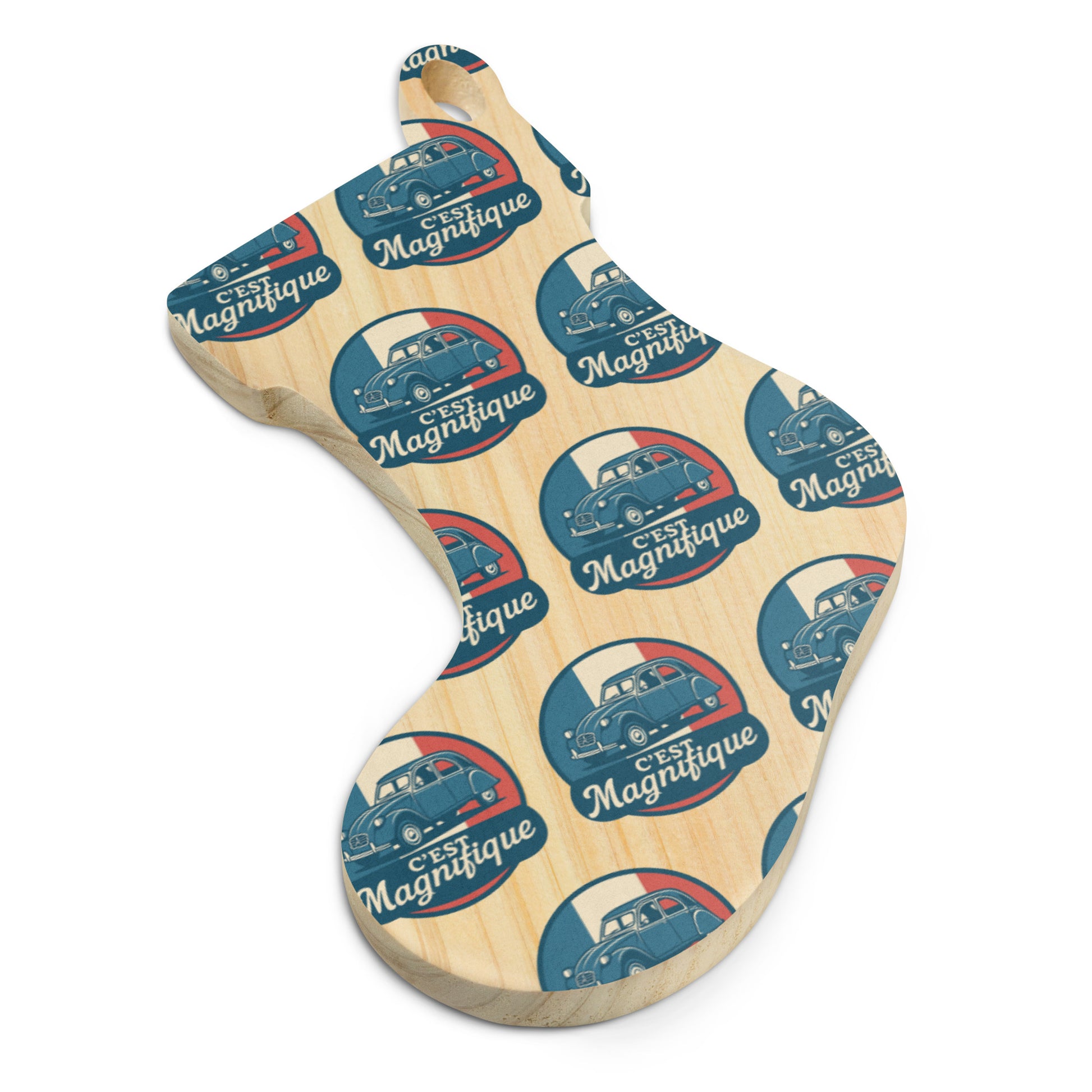 Bring French charm to your Christmas tree! ✨ This double-sided wooden Christmas ornament pays stylish tribute to the legendary Citroën 2CV, the beloved "ugly duck." The elegant retro illustration of the 2CV, set against the French flag with the text "C'est Magnifique," adds a touch of nostalgia to your holiday season.