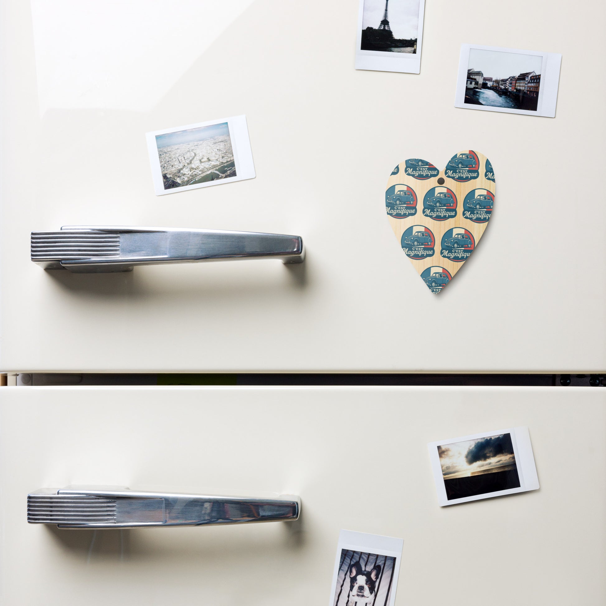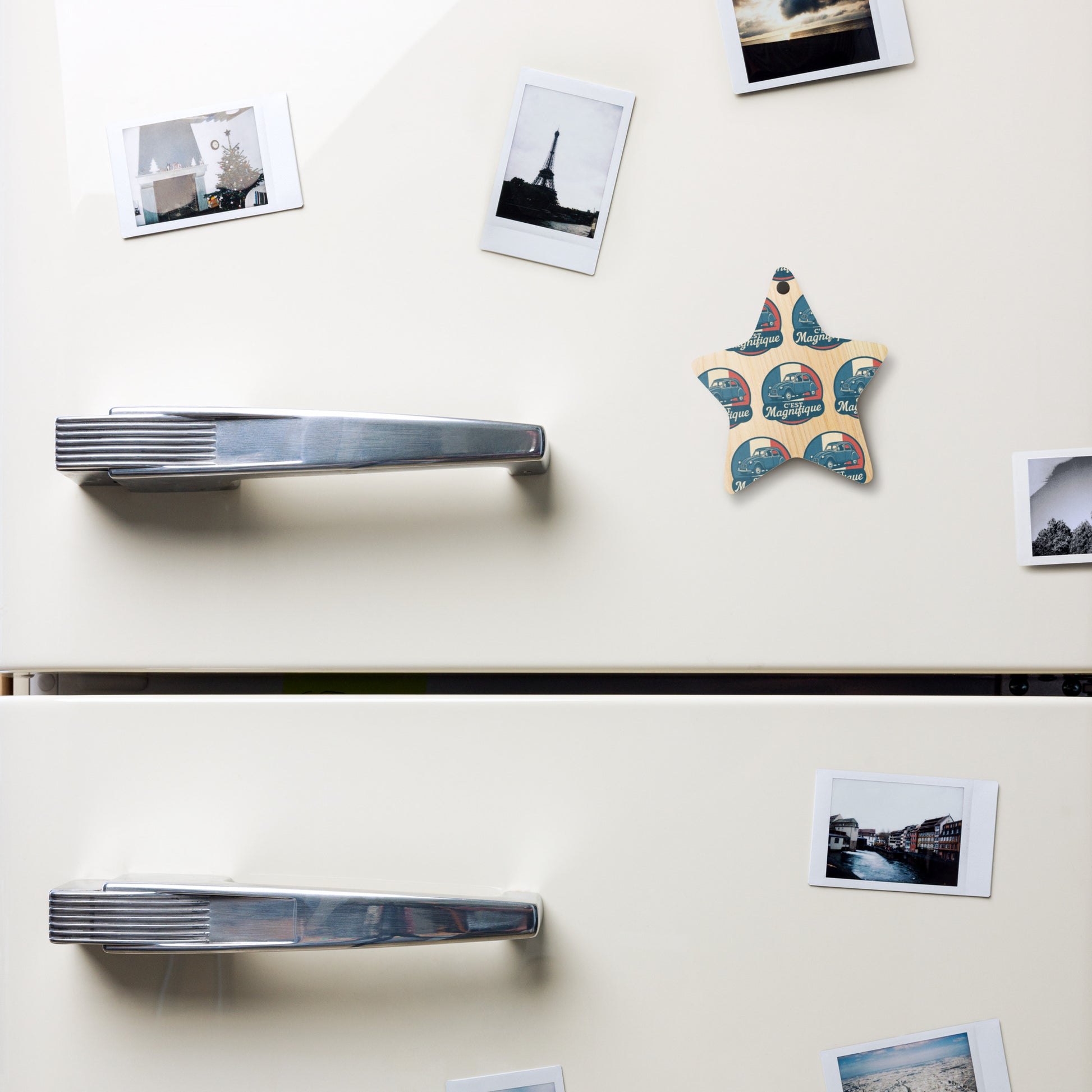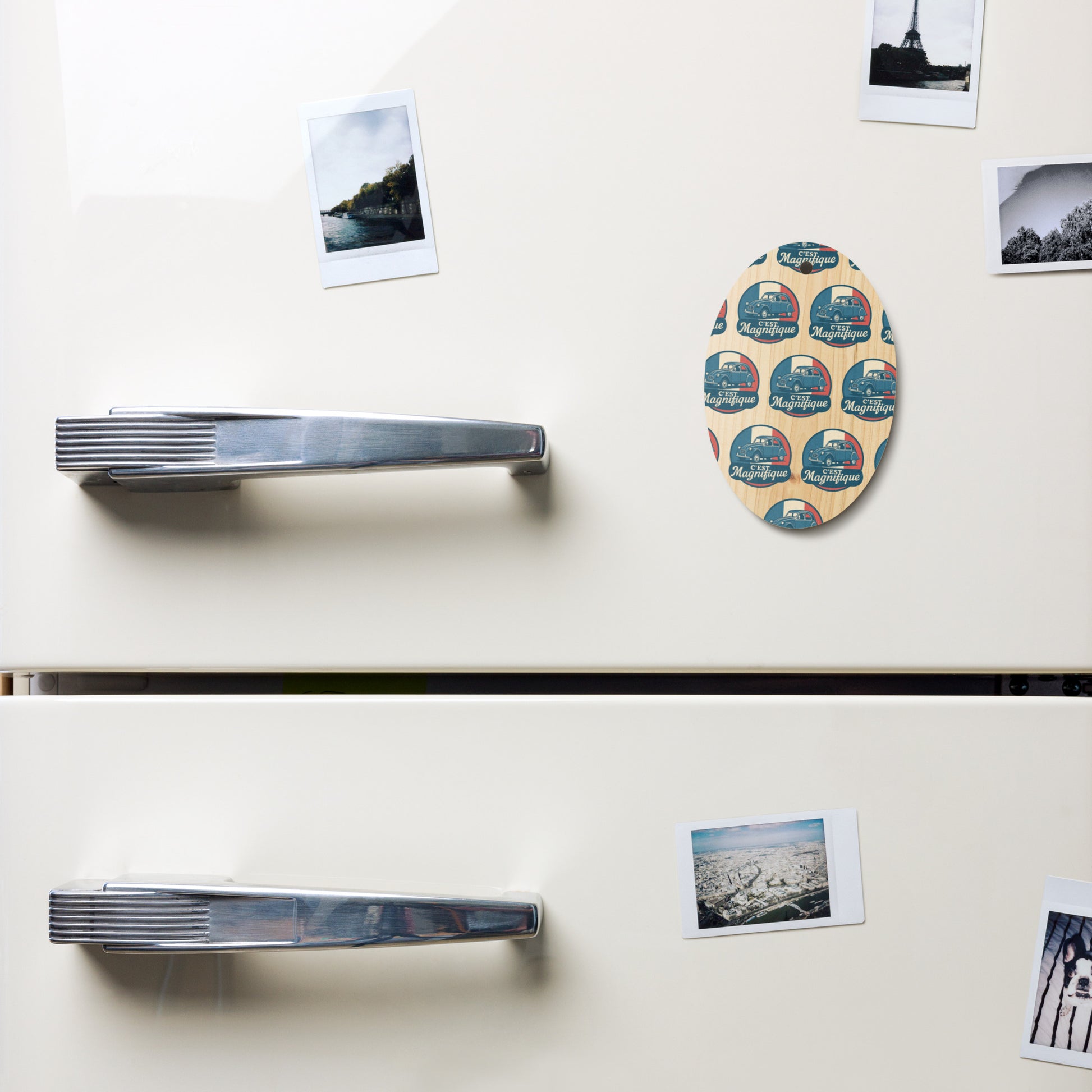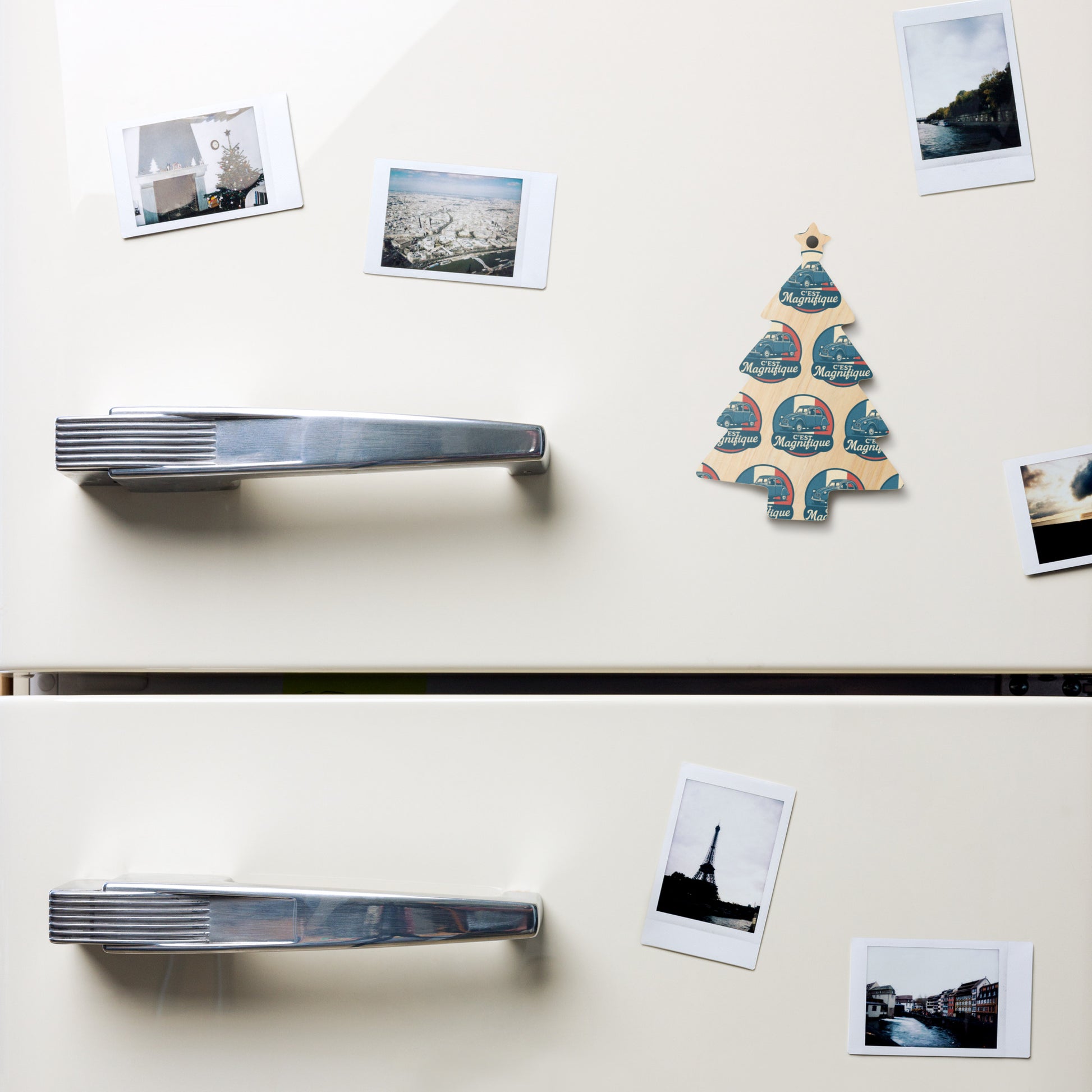 Bring French charm to your Christmas tree! ✨ This double-sided wooden Christmas ornament pays stylish tribute to the legendary Citroën 2CV, the beloved "ugly duck." The elegant retro illustration of the 2CV, set against the French flag with the text "C'est Magnifique," adds a touch of nostalgia to your holiday season.