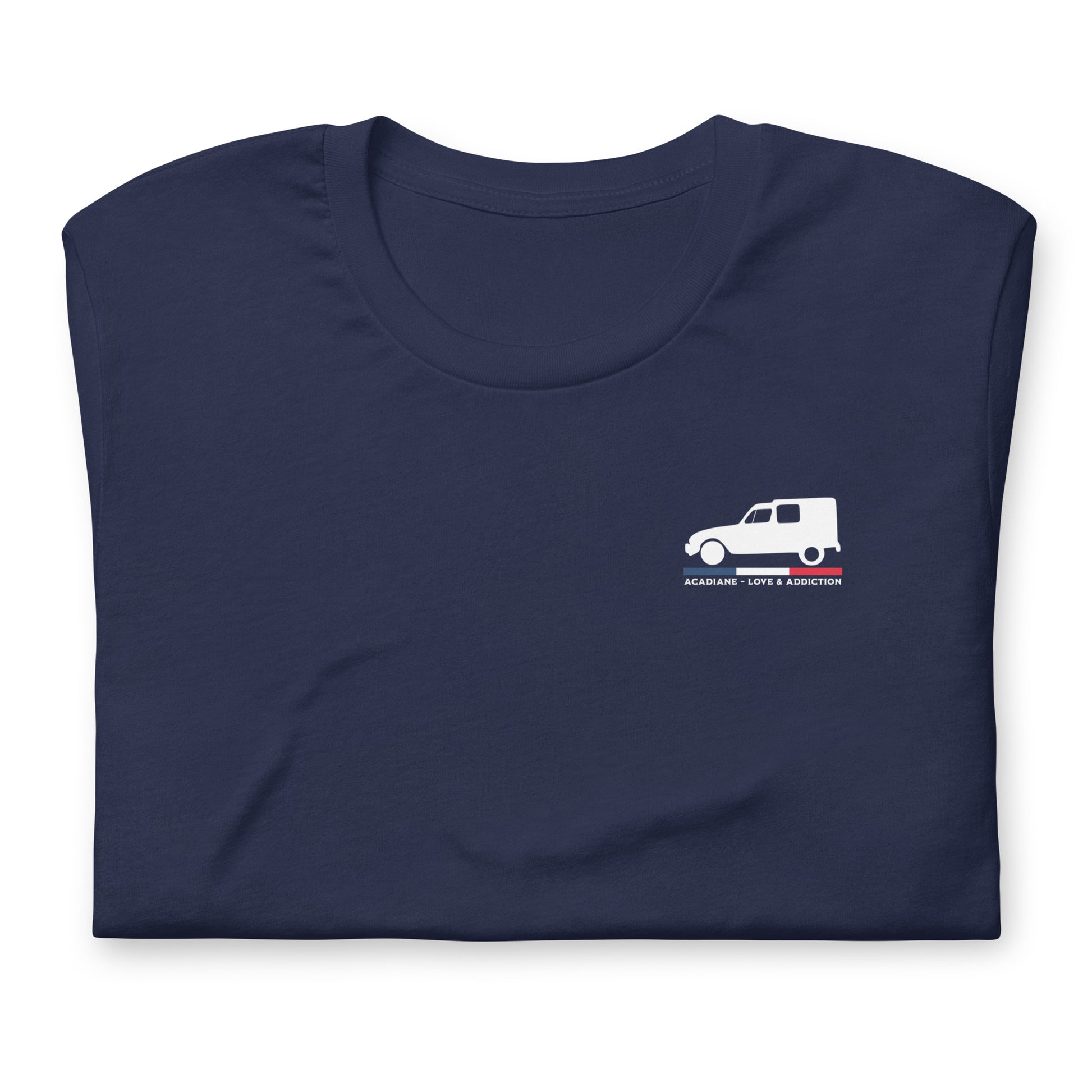 This soft, lightweight unisex T-shirt combines ultimate comfort with a minimalist yet powerful design. The clean white silhouette of the Citroën Acadiane is enhanced by the French tricolor and the proud text "Acadiane – Love & Addiction."