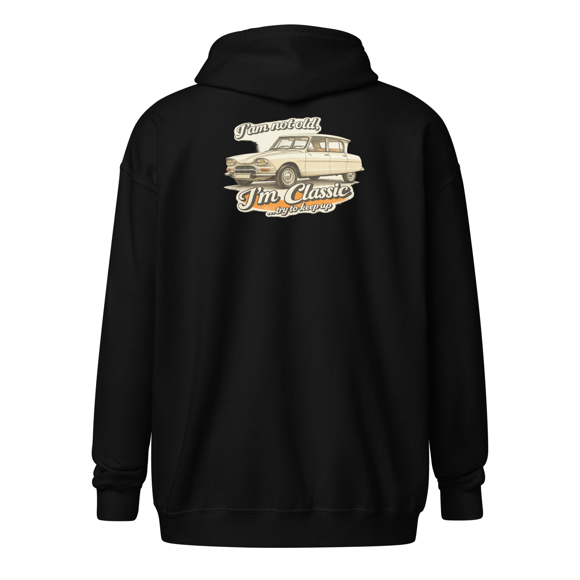 A timeless classic deserves a design that reflects its character. This hoodie from the Classic Collection features a stylish vintage illustration of the iconic Citroën Ami 8. The detailed drawing emphasizes the recognizable lines and elegant, distinctive design of this French classic. Combined with the text "I am not old, I'm Classic – try to keep up," it creates a powerful statement perfect for classic car enthusiasts.
