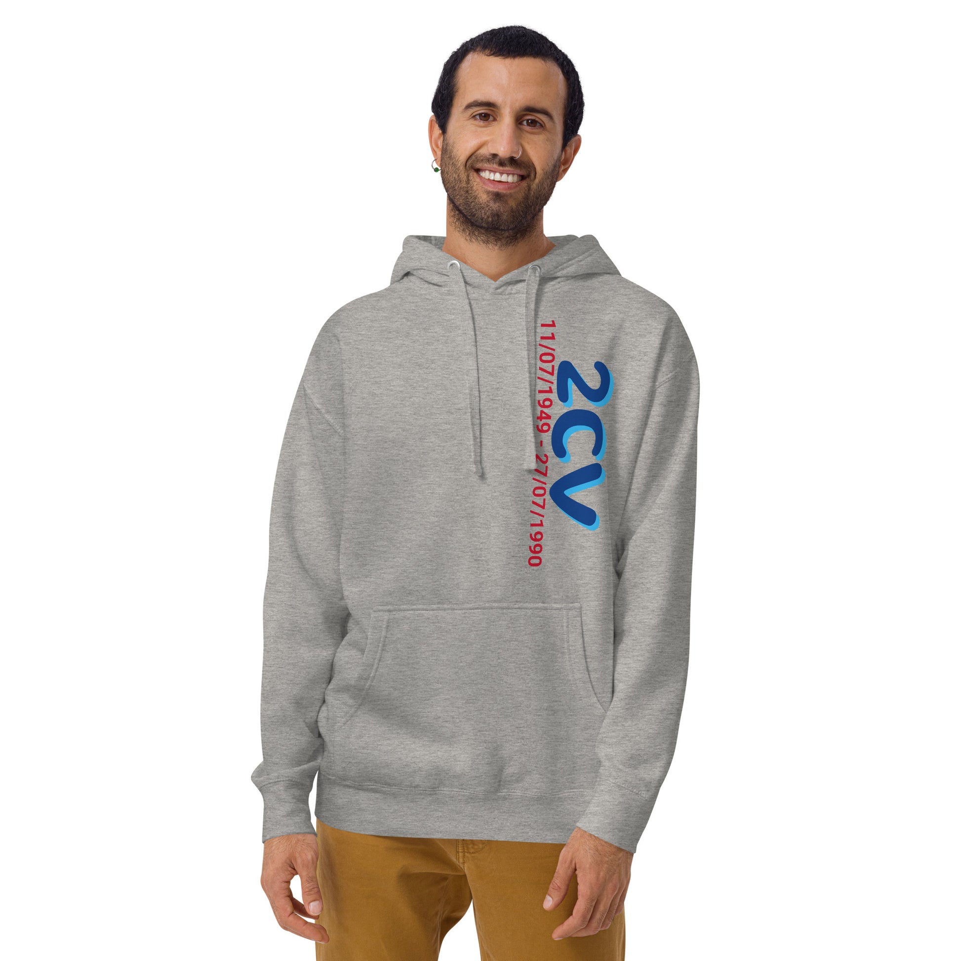 Hoodie with the production period of the Citroën 2cv available in Black, Navy, Gray or White