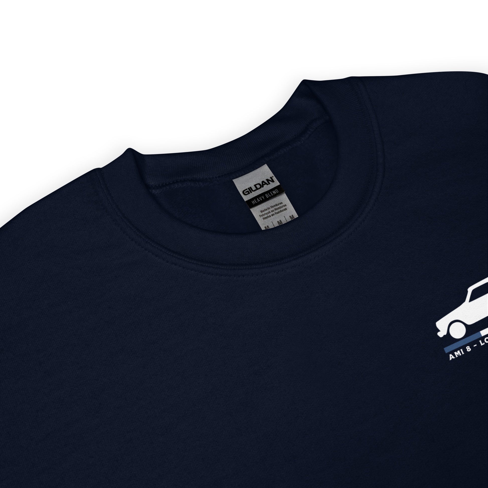 The design pays tribute to the Citroën Ami 8 Break , the charming and reliable French classic known for its unique lines and practicality. The Ami 8 Break's sleek white silhouette stands out elegantly against the black background, with a blue, white, and red stripe below—a subtle nod to its French heritage. The text "AMI 8 – LOVE & ADDICTION" completes the look: a must-have for anyone who wants to show their love for classic Citroëns.