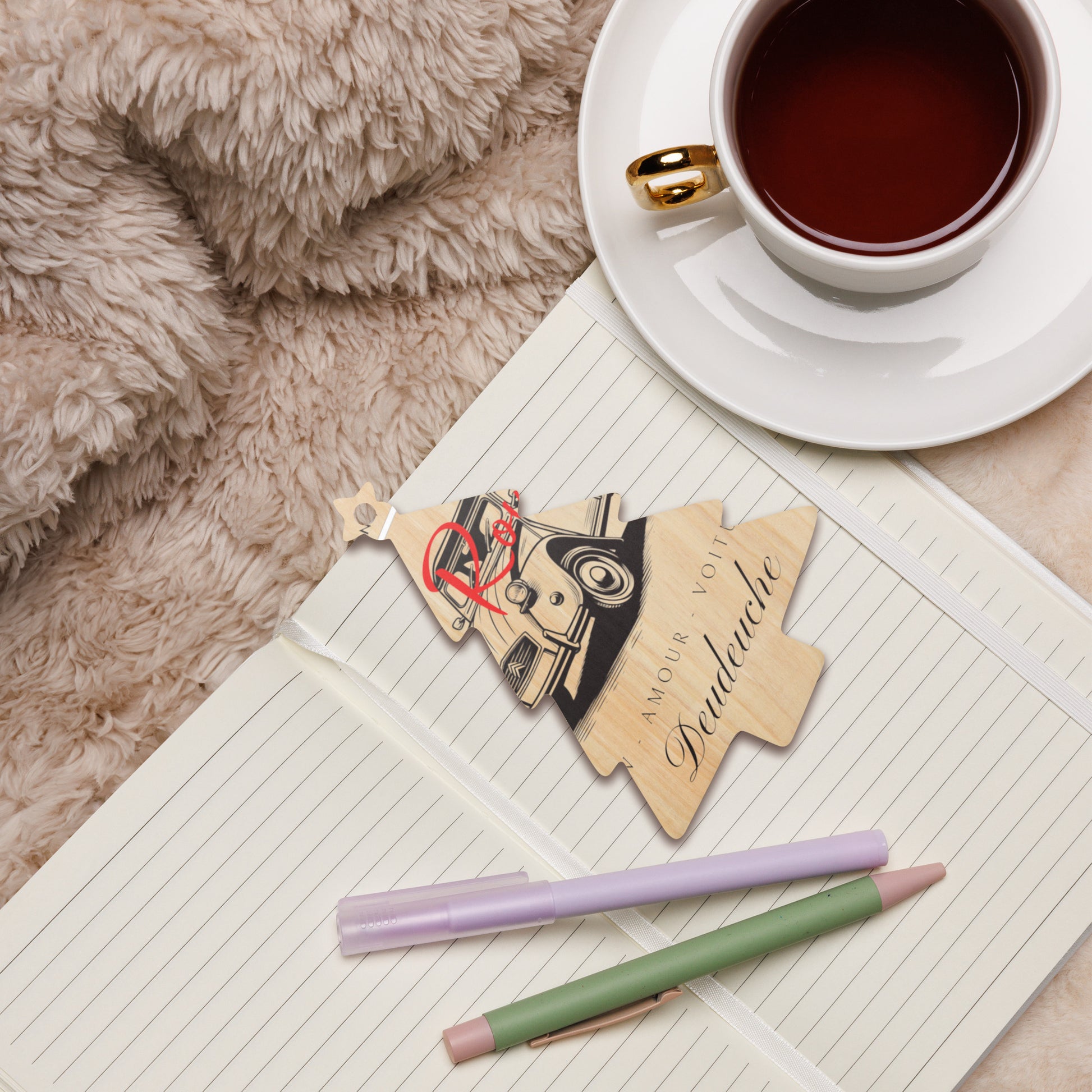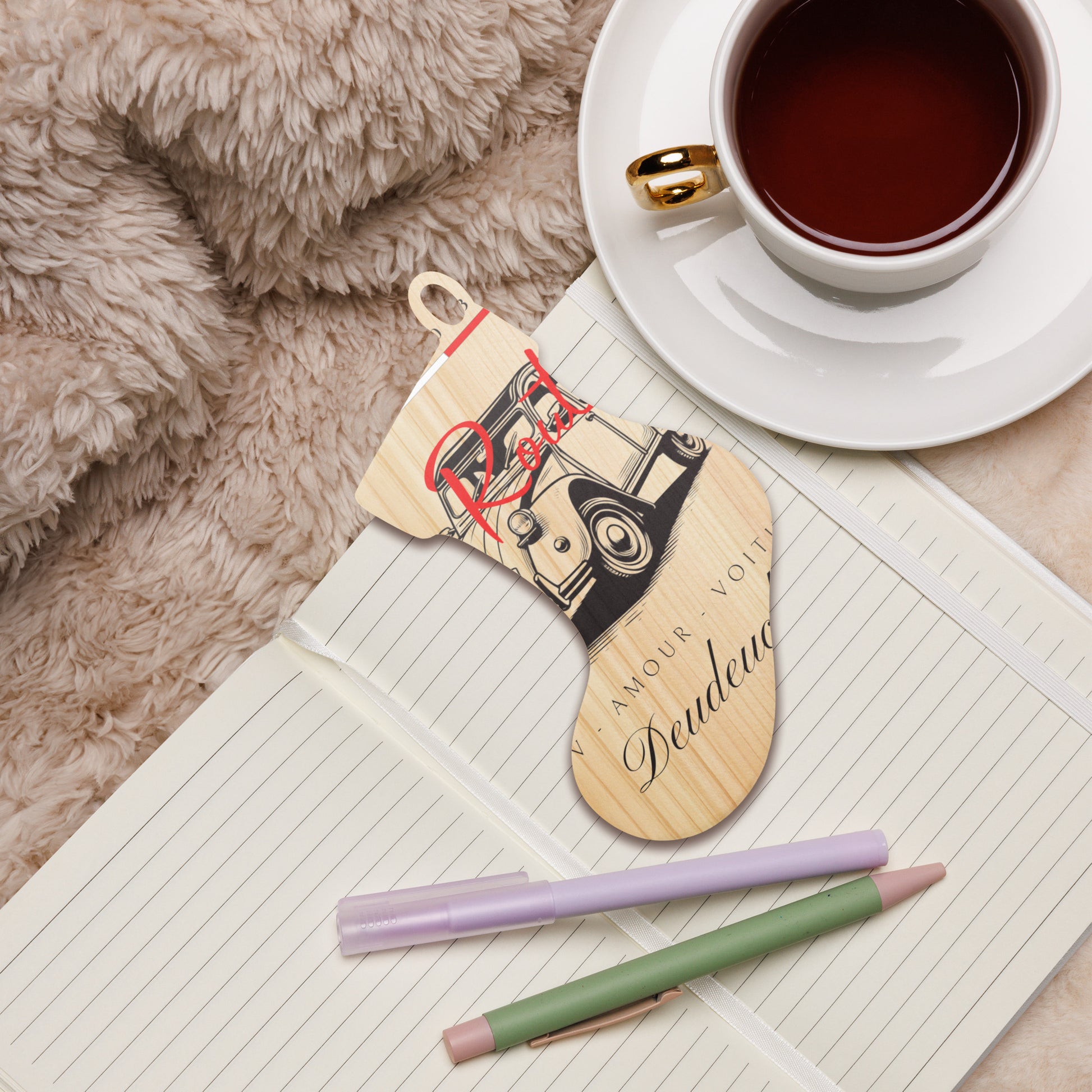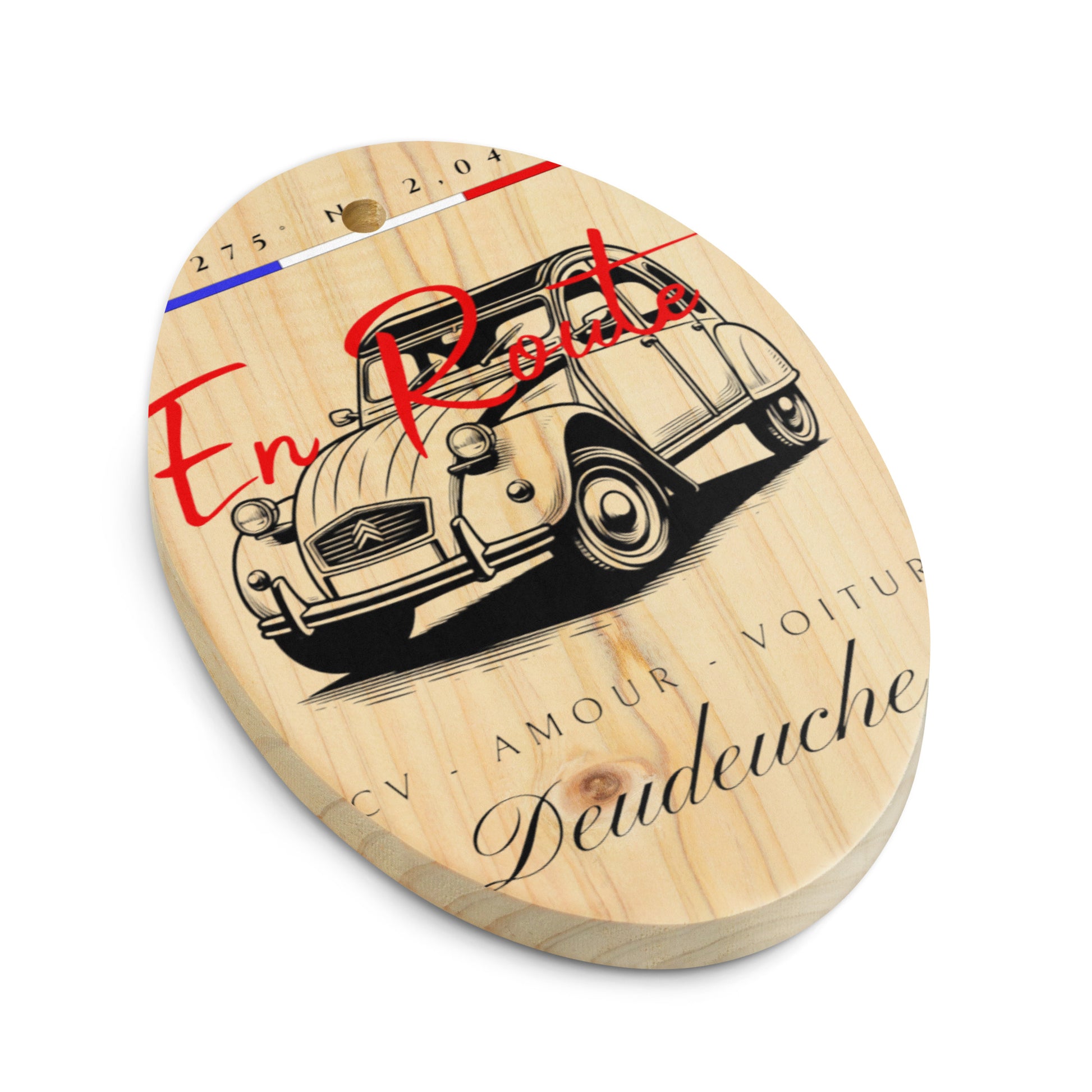 Bring a touch of French nostalgia into your home with this charming wooden ornament. The design features the iconic Citroën 2CV—affectionately known as "Deudeuche" in France—with the playful text "En Route ." Crafted from solid Hinoki wood, this ornament feels warm and soft to the touch, yet is sturdy and durable. Thanks to its double-sided print, magnetic backing, and included red ribbon, this ornament is versatile: hang it on the Christmas tree, decorate a doorknob, or use it as a stylish magnet on the refrigerator.