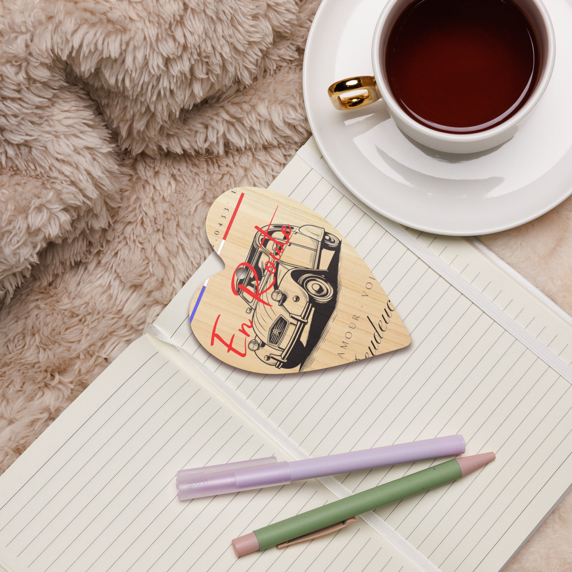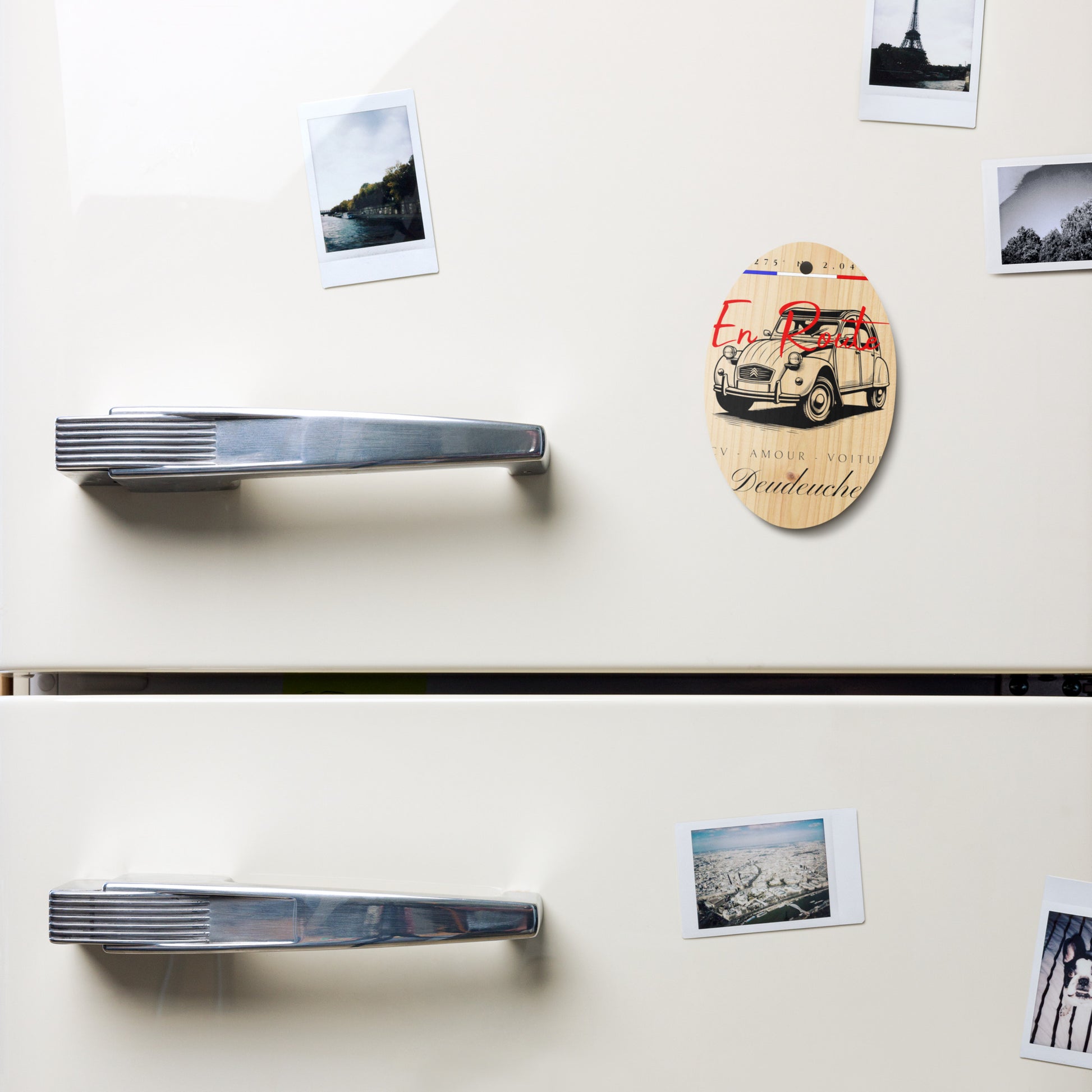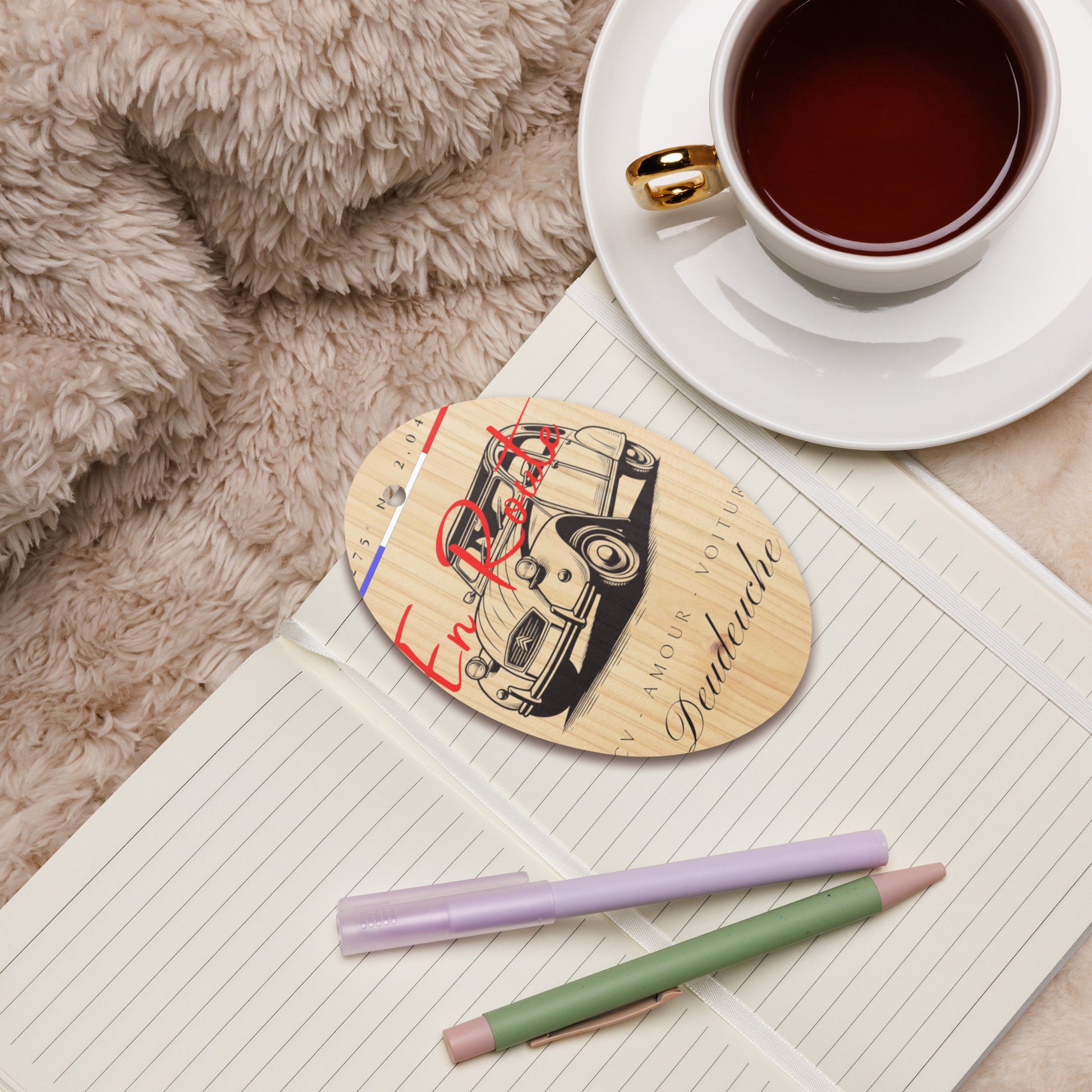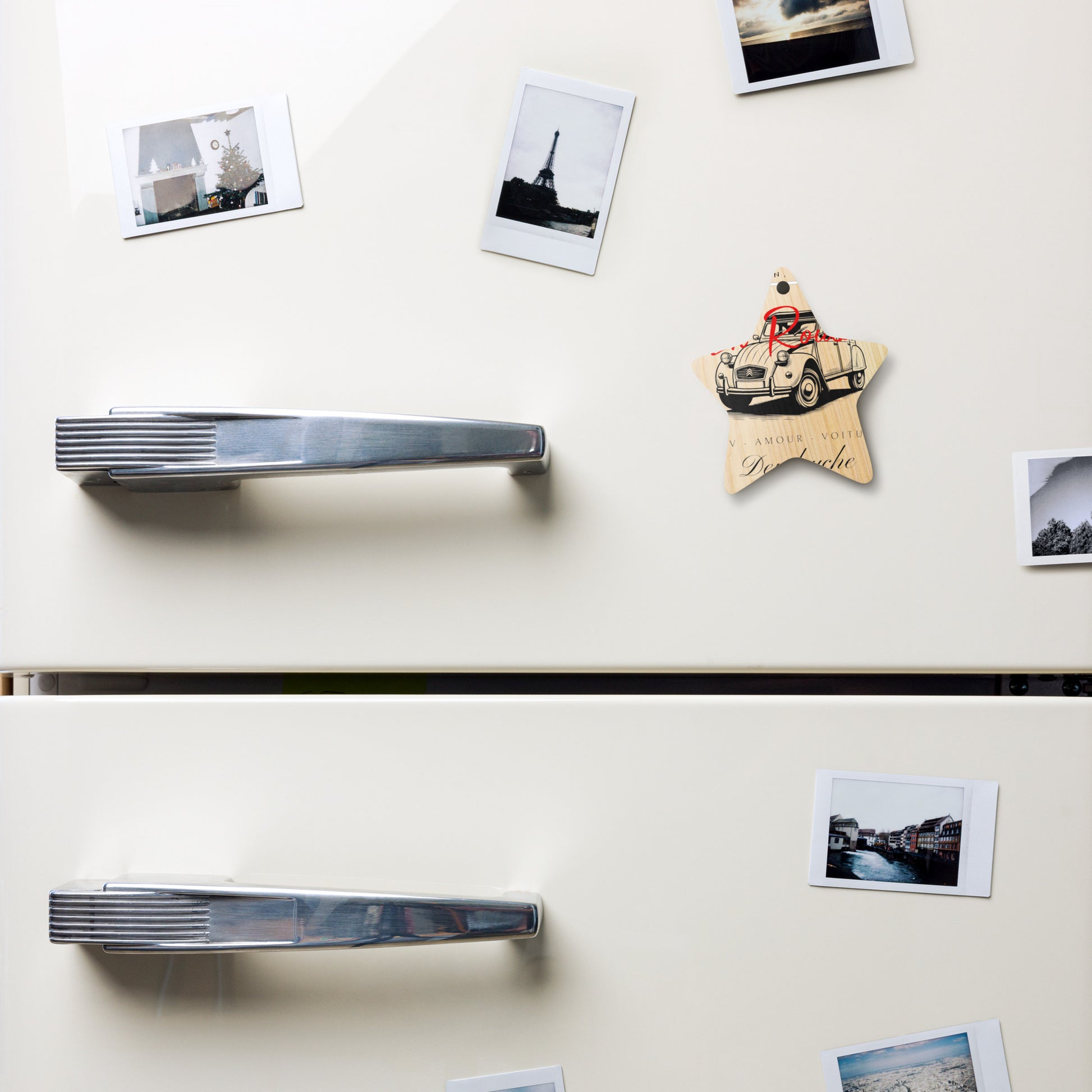 Bring a touch of French nostalgia into your home with this charming wooden ornament. The design features the iconic Citroën 2CV—affectionately known as "Deudeuche" in France—with the playful text "En Route ." Crafted from solid Hinoki wood, this ornament feels warm and soft to the touch, yet is sturdy and durable. Thanks to its double-sided print, magnetic backing, and included red ribbon, this ornament is versatile: hang it on the Christmas tree, decorate a doorknob, or use it as a stylish magnet on the refrigerator.