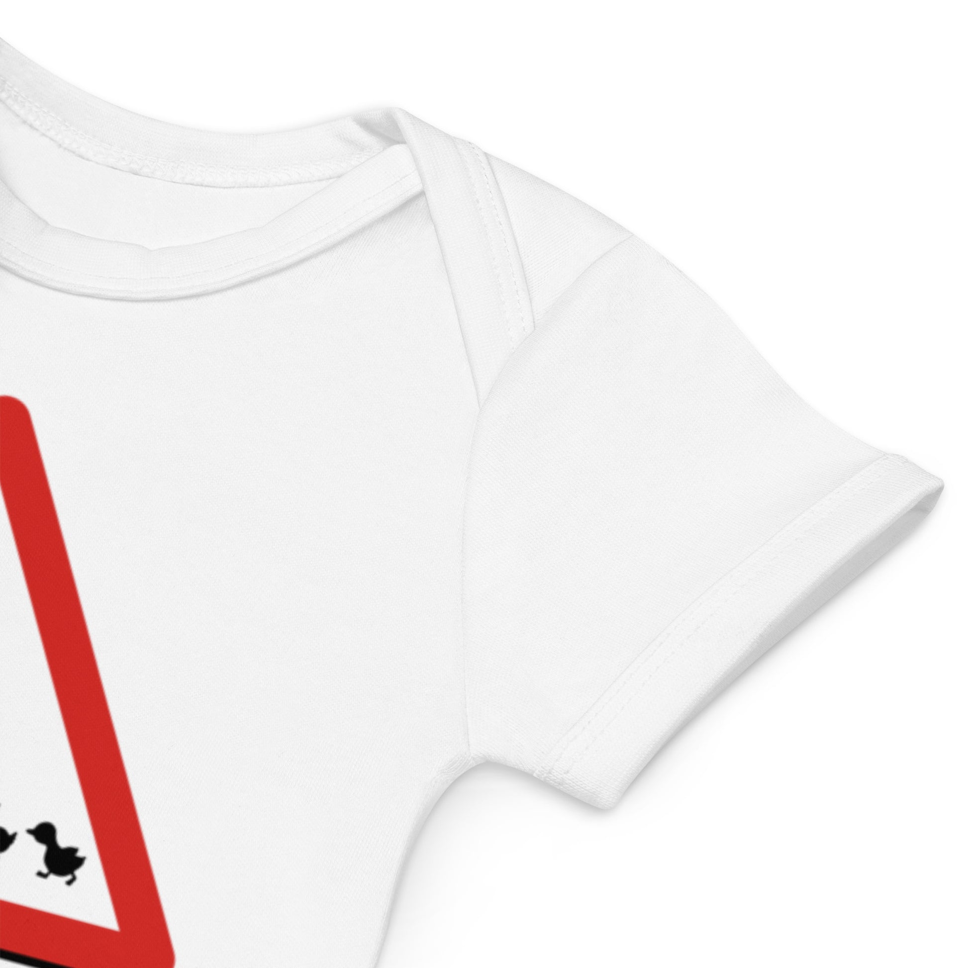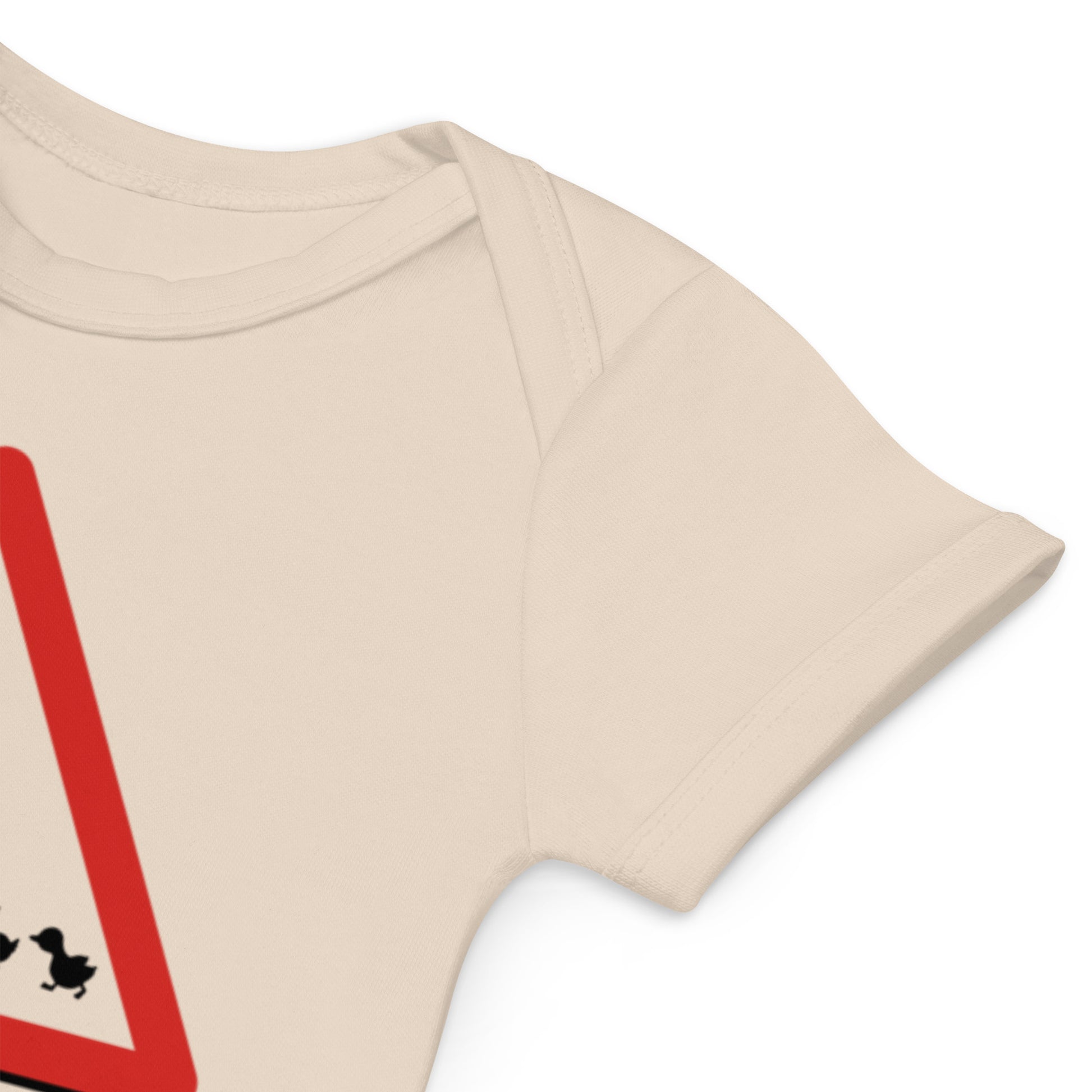 Des canards traversent la route ! Cette barboteuse bio pour bébé n'est pas n'importe quelle barboteuse : c'est un clin d'œil à la légendaire Citroën 2CV. Son design ludique, avec un panneau d'avertissement et des canards joyeux, fera sourire tous les passionnés d'automobile et fera de votre tout-petit la star du spectacle.