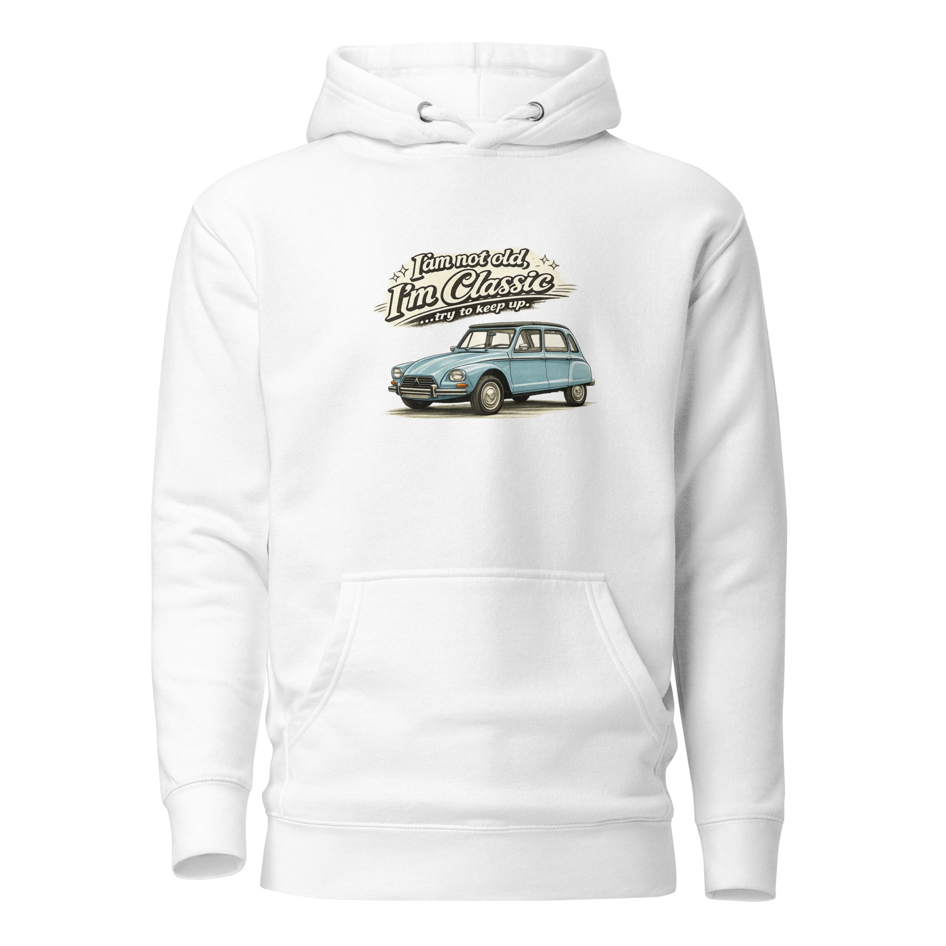 Sweat à capuche premium Classic Collection – Illustration Citroën Dyane – « Je ne suis pas vieux, je suis classique »