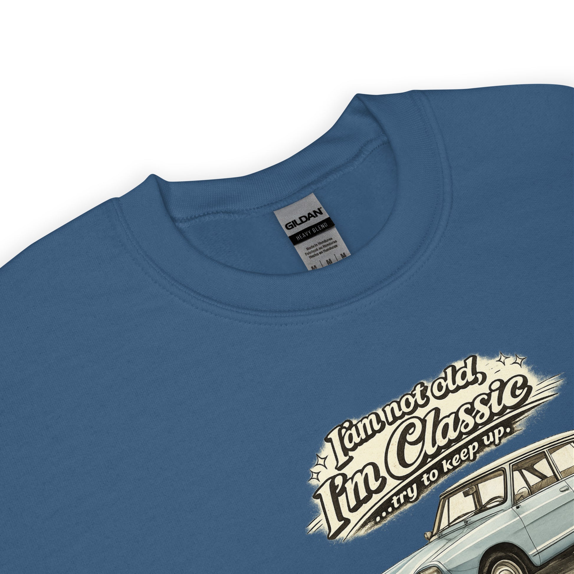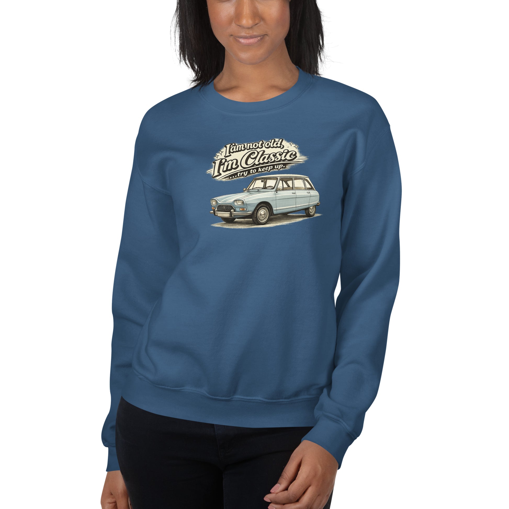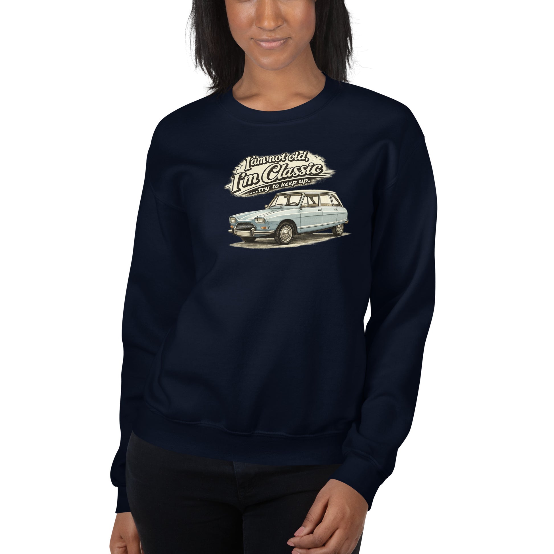 Centraal op het sweatshirt staat een zorgvuldig uitgewerkte vintage tekening van de Citroën Ami 8 in een stijlvolle lichtblauwe uitvoering. De illustratie benadrukt de unieke lijnen en het herkenbare ontwerp van deze klassieke Franse wagen. Boven de auto staat de speelse tekst “I’m not old, I’m Classic… try to keep up.” wat het ontwerp een nostalgische en humoristische uitstraling geeft. De tekening vormt het echte middelpunt van dit sweatshirt en maakt het een perfecte keuze voor liefhebbers van klassieke auto's, vintage design en Franse autoklassiekers.
