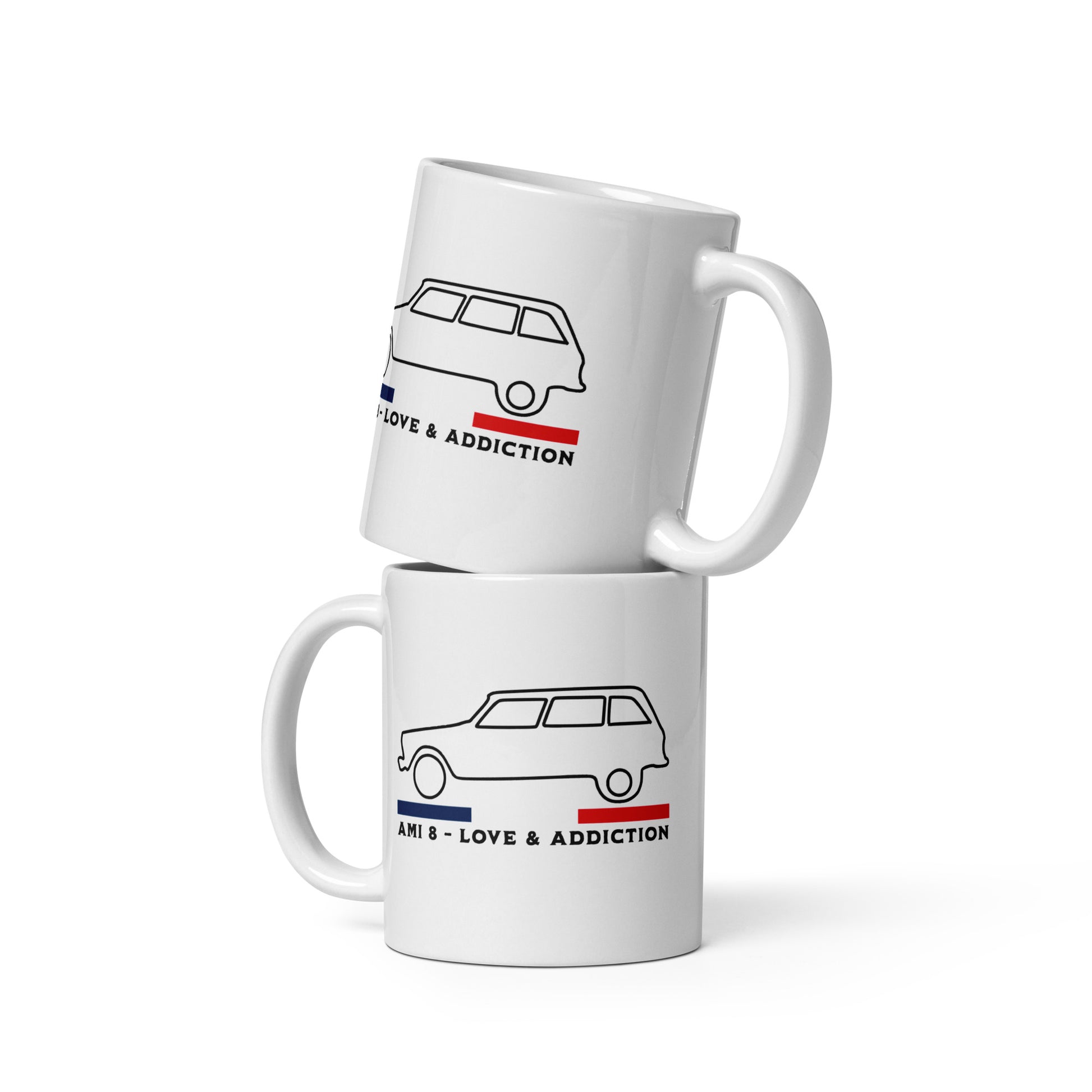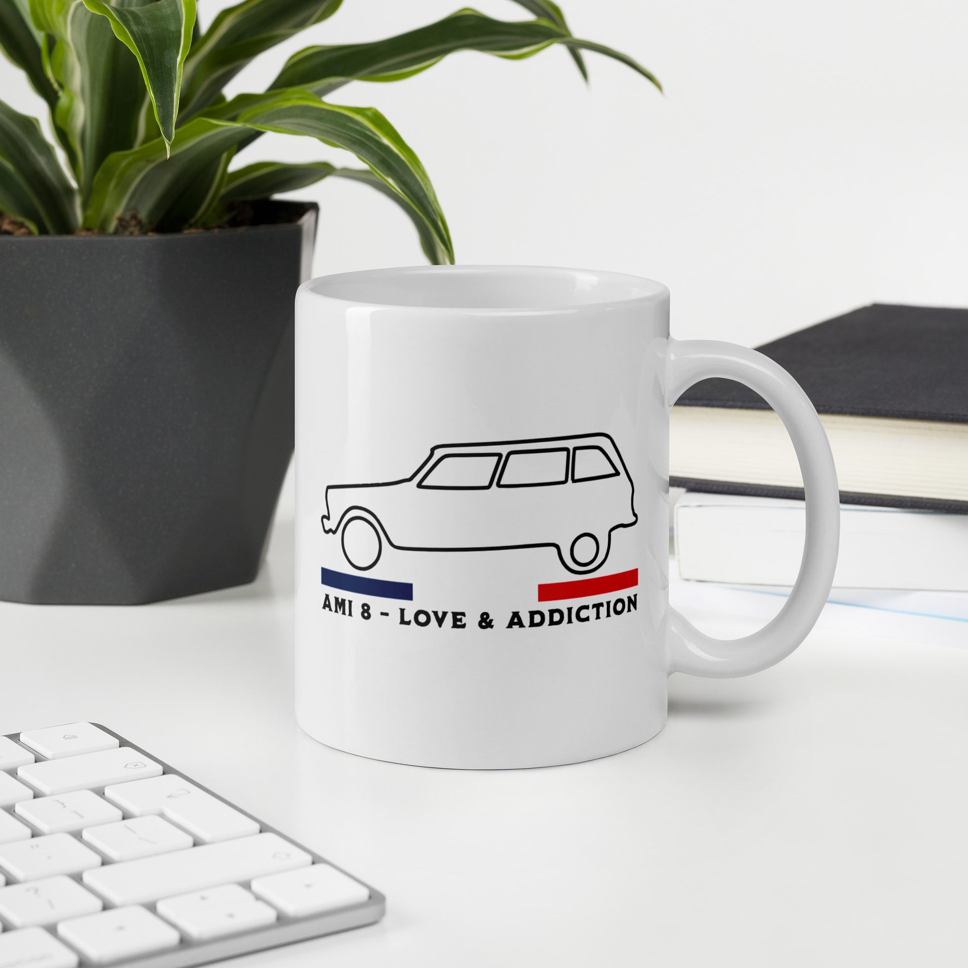 Het design is een eerbetoon aan de Citroën Ami 8 Break, de geliefde Franse klassieker die bekendstaat om haar eenvoud, betrouwbaarheid en charmante lijnen. Het minimalistische witte silhouet van de Ami 8 springt krachtig naar voren tegen de zwarte achtergrond, geaccentueerd door de Franse tricolore (blauw, wit, rood) en de trotse tekst: “AMI 8 – LOVE & ADDICTION”.